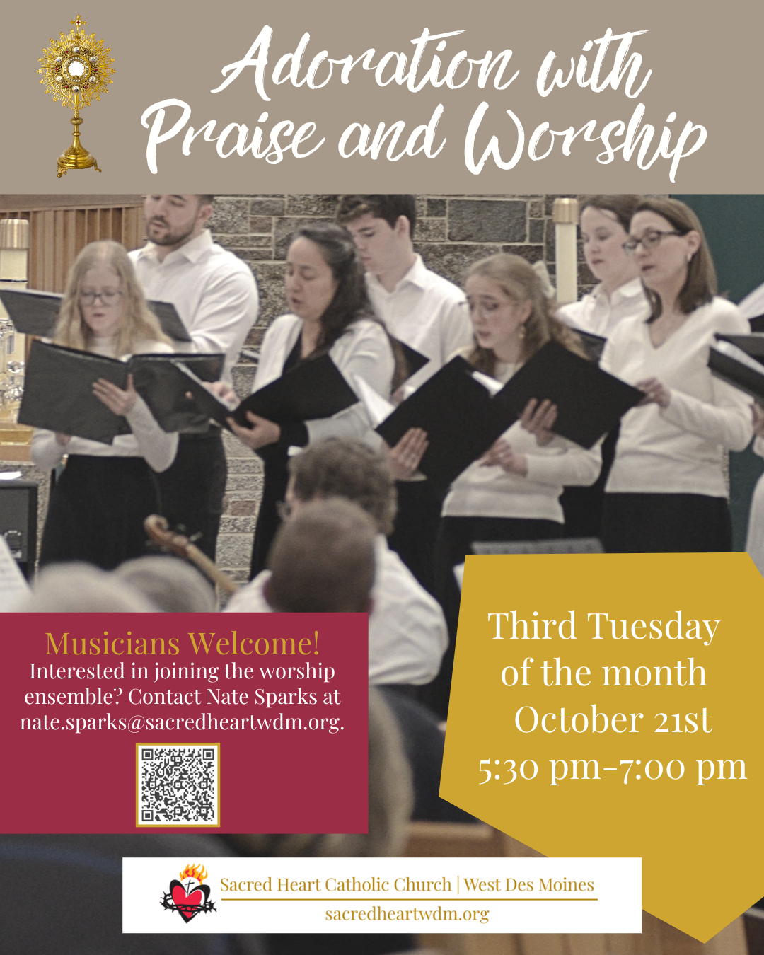Every Tuesday, Sacred Heart will welcomes all to Adoration of the Holy Eucharist from 8:30 am - 7 pm. If you would like to sign up to take a 30 minute or 1 hour shift for Adoration, please email
