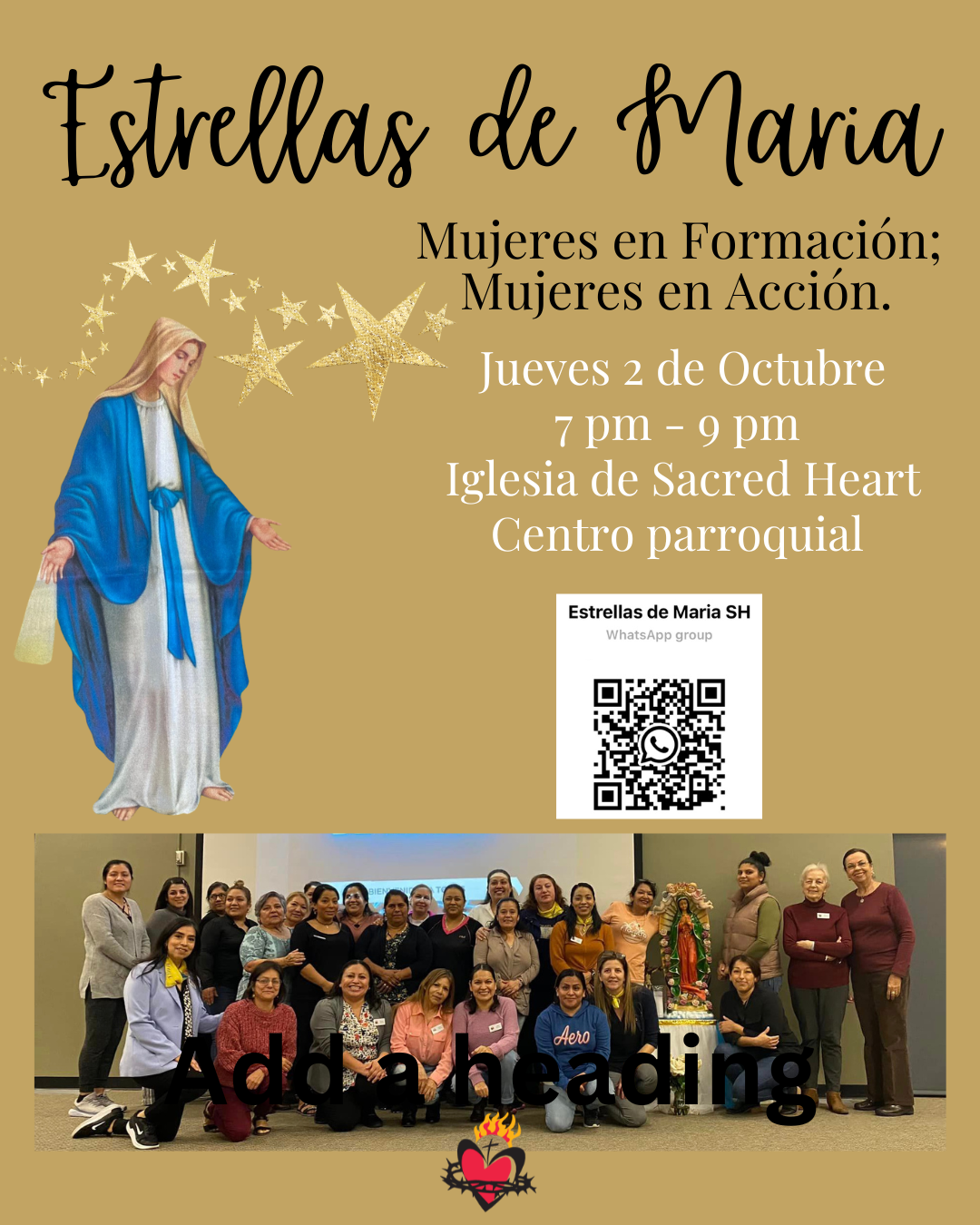 Las mujeres del Sagrado Corazón están invitadas a unirse a nosotros el primer jueves de cada mes a las 7 p.m. en el Centro Parroquial. ¡Nos reunimos mensualmente para rezar, aprender sobre nuestra fe y hacer nuevas amistades!